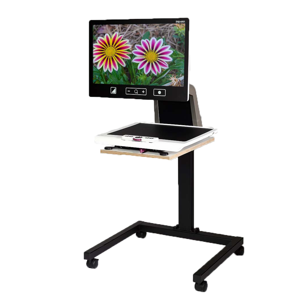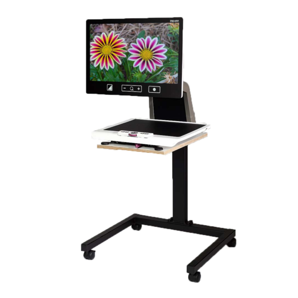 Floorstand for electronic magnifier. Adjustable height / on castors with brake.
