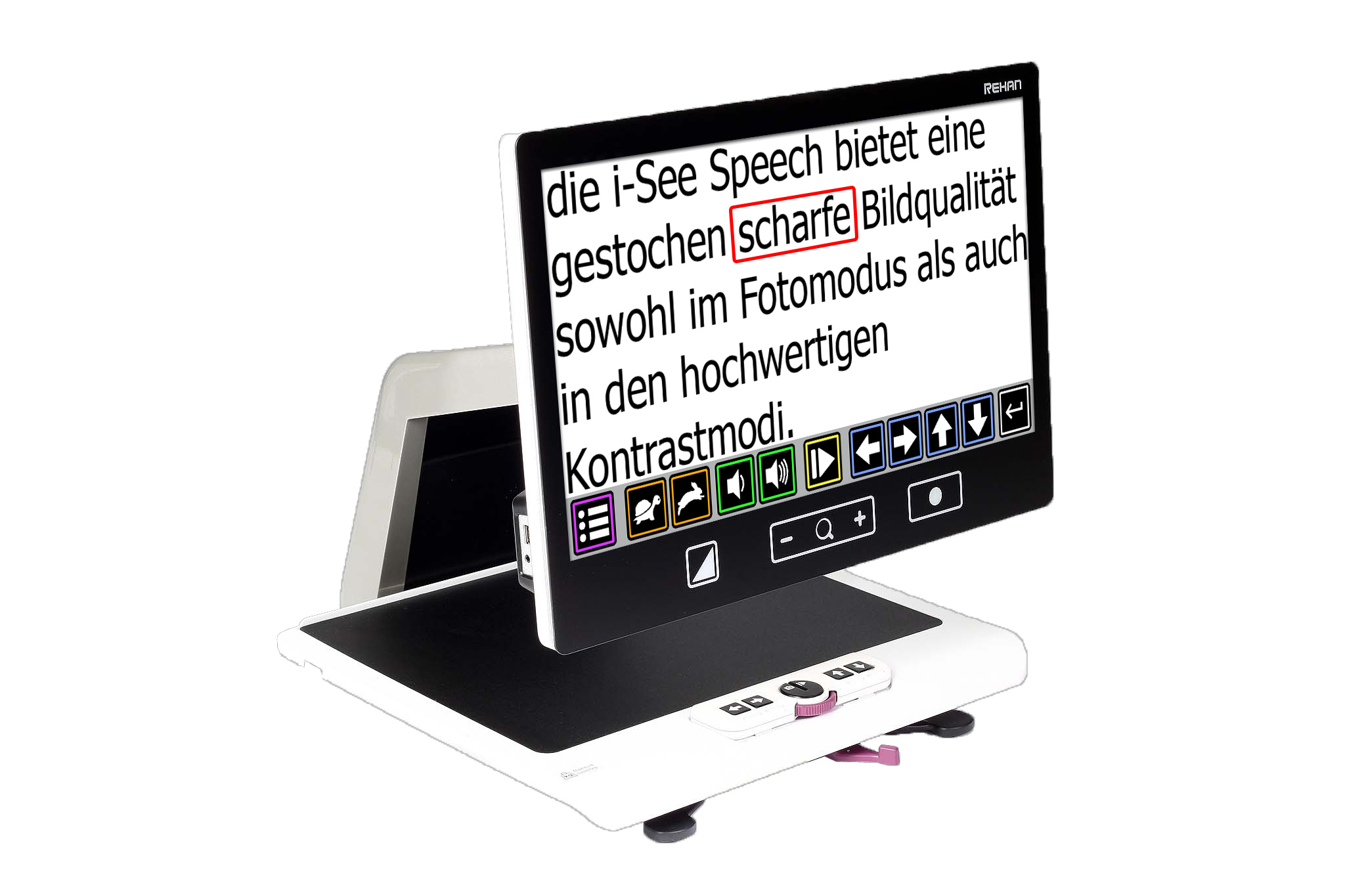 Dank der eigens entwickelten Full HD-Kamera und des Full HD-Panels liefert der i-See Speech sowohl im Fotomodus als auch im hochwertigen Kontrastmodus eine gestochen scharfe Bildqualität. Mit der minimalen Vergrößerung von 2 × liefert die i-See Speech das gewünschte Ergebnis, so dass die maximale Rendite aus der vollständigen Übersicht eines A4 erzielt werden kann. Wenn Sie hauptsächlich Kontrast benötigen, gehen wir noch einen Schritt weiter und bieten eine Vergrößerung von nur 1 ×.